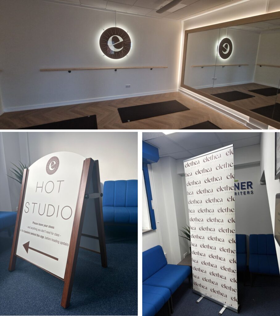 Our work for Elethea Studios includes window graphics, perspex signs, and roller pop-ups. Each has been designed to enhance their brand presence and create a professional, welcoming environment